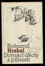 Domácí úkoly z pilnosti se tak trochu vymykají z Hrabalovy prozaické tvorby,stojí jaksi na jejím okraji. Je to do jisté míry koláž z jeho esejů, poznámek, rozhovorů, interviewů, medailonků o výtvarnících, statí a článků, drobných lyrických i filozofických miniatur, které ve svém souhrnu ukazují šíři Hrabalových zájmů, přesahující dalece oblast literatury.