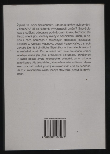 Žijeme ve „spící společnosti“, kde se skutečný svět změnil v obrazy? A jak se na tomto výtvoru podílí umění? Snové obrazy a události odedávna podněcovaly lidskou tvořivost. Do Hnízd snění jsou vloženy úvahy o básnickém umění, o dechu a čáře, obrazech a nalezených objektech, instalacích i akcích. O rychlosti Máchově, posteli Franze Kafky, o snech Jakuba Demla i Jindřicha Štyrského, o traumatech zrození a vražedné smrti. Sen a snění nám také současné umění ukazuje nikoli jen jako produktivní obraznost, ohroženou v každé oblasti života nebezpečím ovládání, schematizace a politizace. Ale jako trhlinu, která nás otevírá vnitřnímu dynamismu a nutí změnit postoj ke skutečnosti a ve skutečnosti. Je to v „mihotavém světle“ pohyb otevírající, pohyb k otevřenosti.
