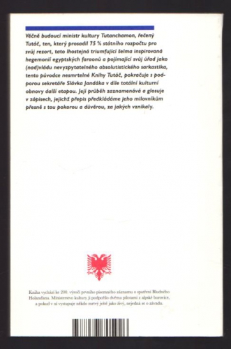 Věčně budoucí ministr kultury Tutanchamon, řečený Tutáč, ten, který prosadil 75 % státního rozpočtu pro svůj rezort, tato lhostejná triumfující šelma inspirovaná hegemonií egyptských faraonů a pojímající svůj úřad jako (nad)vládu nevyzpytatelného absolutistického sarkastika, tento původce nesmrtelné Knihy Tutáč, pokračuje s podporou sekretáře Slávka Jandáka v díle totální kulturní obnovy další etapou. Její průběh zaznamenává a glosuje v zápisech, jejichž přepis předkládáme jeho milovníkům přesně s tou pokorou a důvěrou, za jakých vznikaly.