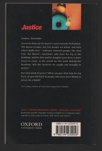 Stage 3 (1000 headwords) - London: November. Terrorists blow up the Queen's coach outside Parliament. The Queen escapes, but five people are killed, and forty others badly hurt - ordinary, innocent people, like Alan Cole, the Queen's coachman, who loses his leg in the bombing. And for Alan and his daughter Jane there is more terror to come, in the search for the truth behind the bombing. Will the terrorists be caught and brought to justice? But what kind of justice? What can give Alan Cole his leg back, or give life back to people who have been blown to pieces by a bomb?