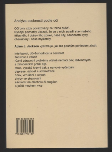 Kniha je úplným průvodcem k rozboru osobnosti (zdraví, emoce, charakter, citový a milostný život) prostřednictvím očí a shrnuje nejnovější vědecké poznatky potvrzující starobylý názor "oči - okna do duše"