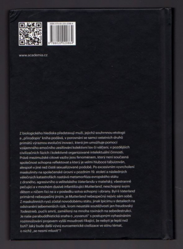 Jaké jsou etologie a životní strategie příslušníků mužského pohlaví u lidí i v živočišné říši? Jak vlastně fungují mužské society a co je jejich emocionálním tmelem? Nadchází v západní společnosti soumrak tradiční maskulinity a kam se vlastně stáhla či v co se proměnila? Jak se změnil stát, kdysi drsný a k obětem vyzývající Vaterland, ve všeobjímavě pečující Mutterland? Nejeví se islámský svět jako ohrožující hlavně proto, že v něm tato proměna neproběhla? Směřuje západní svět k pozvolnému „vyvanutí“ a „ublahobytnění“, souvisejícímu se stále nižší produkcí potomstva? Jak moc jsou rozdíly mezi pohlavími dané dědičně a v jakém rozsahu kulturně, nedochází vlastně paralelně s „krizí maskulinity“ i ke „krizi femininity“?