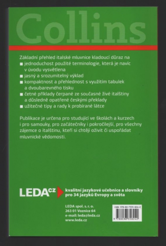 Základní přehled italské mluvnice kladoucí důraz na jednoduchost použité terminologie, která je navíc v úvodu vysvětlena, jasný, srozumitelný výklad a přehlednost, jíž napomáhá využití tabulek a dvoubarevný tisk. Výklad provázejí četné názorné příklady čerpané ze současné živé italštiny a důsledně opatřené českými překlady. U jednotlivých gramatických jevů jsou uváděny tipy a praktické rady, které napomáhají zapamatování nebo upozorňují na důležité souvislosti.