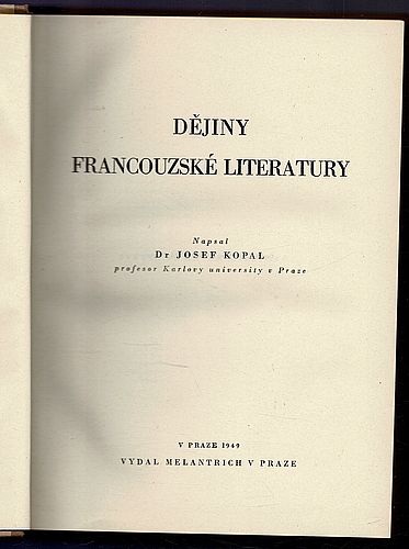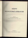 První české souborné dějiny francouzské literatury od nejstarších památek až po dobu nejnovější rozvržené do 8 částí: Středověk, renesance, doba baroku, věk klasiků, období osvěty a preromantismu, romantismus, realismus a naturalismus, literatura posledního padesátiletí. Bibliografie k jednotlivým statím uvádí i díla, vydaná za druhé světové války a po ní.