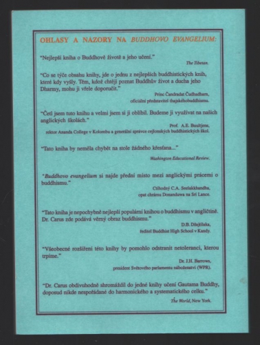 Nejlepší kniha o Buddhově životě a jeho učení. (The Tibetan.) Co se týče obsahu knihy, jde o jednu z nejlepších buddhistických knih, které kdy vyšly. Těm, kdož chtějí poznat Buddhův život a ducha jeho Dharmy, mohu ji vřele doporučit. (Princ Čandradat Čudhadharn, oficiální představitel thajského buddhismu.) Četl jsem tuto knihu a velmi jsem si ji oblíbil. Budeme ji využívat na našich anglických školách. (Prof. A.E. Buultjens, rektor Ananda College v Kolombu a generální správce cejlonských buddhistických škol.) Tato kniha by neměla chybět na stole žádného křesťana... ( Washington Educational Review.) Buddhovo evangelium si najde přední místo mezi anglickými prácemi o buddhismu. (Ctihodný C.A. Seelakkhandha, opat chrámu Donanduwa na Srí Lance.) Tato kniha je nepochybně nejlepší populární knihou o buddhismu v angličtině. Dr. Carus zde podává věrný obraz buddhismu. ( D.B. Džajtilaka, ředitel Buddhist High School v Kandy) Všeobecné rozšíření této knihy by pomohlo odstranit netoleranci, kterou trpíme. ( Dr. J.H. Barrows, president Světového parlamentu náboženství). Dr. Carus obdivuhodně shromáždil do jedné knihy učení Gautama Buddhy, doposud nikde nespořádané do harmonického a systematického celku.