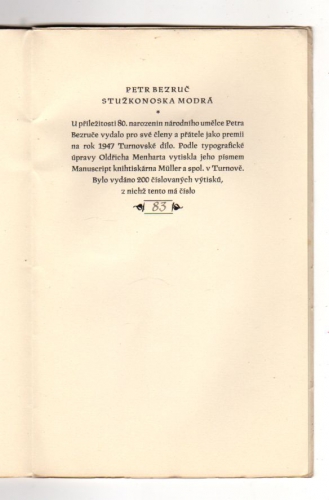 U příležitosti 80. narozenin národního umělce Petra Bezruče vydalo pro své členy a přátele jako prémii na rok 1947 Turnovské dílo.
