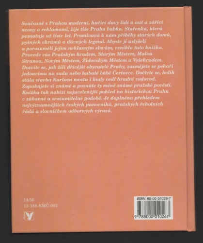 Současně s moderní Prahou žije tiše Praha babka, která pamatuje už tisíc let. Promlouvá k nám příběhy starých domů, pyšných chrámů a dávných legend. Kniha vás provede Pražským hradem, Starým Městem, Malou Stranou, Novým Městem, Židovským Městem a Vyšehradem. Dozvíte se, jak žili dřívější obyvatelé Prahy, zasmějete se pekaři jedoucímu na sudu nebo hubaté bábě Čertovce. Knížka nabízí nejucelenější pohled na historickou Prahu v zábavné a srozumitelné podobě. Je doplněna přehledem nejvýznamnějších českých panovníků, pražských řeholních řádů a slovníčkem odborných výrazů. Výborný tichý průvodce při procházkách starou Prahou!