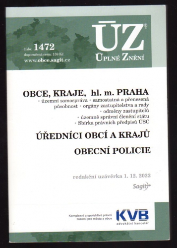 Rozsáhlý soubor 23 předpisů v úplném znění je rozdělen od pěti kapitol: územní samospráva, úředníci územních samosprávných celků, obecní policie, územně správní členění státu, ostatní předpisy. Změny nastaly u zákonů o obcích, o krajích a o hl. městě Praze; dále se změnil zákon o obecní policii (zadržení SPZ, zabránění v jízdě vozidla) a některé další předpisy. Nový je zákon o Sbírce právních předpisů ÚSC a některých správních úřadů. Všechny změny jsou zvýrazněny tučně. Některé související předpisy najdete v ÚZ Svobodný přístup k informacím, eGovernment a v ÚZ Vnitřní správa.