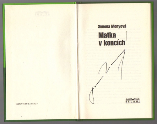 Podpis Simony Monyové - Základním omylem většiny matek je domněnka, že se zvyšujícím se věkem by měly zmoudřet a výchovu potomků zvládat snadněji. Ve skutečnosti však jde pouze o to , aby si každá matka dokázala zachovat aspoň tolik rozumu, kolik měla , než svoje děti počala. Kniha Matka v koncích je volným pokračováním knihy Matka v krizi.