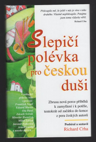 Veskrze pozitivní přístup k životu je společným rysem dojemných, úsměvných i slitovných, především ale hluboce lidských příběhů, které jsme pro své čtenáře shromáždili v této české variantě Slepičí polévky, to je sbírce příběhů, které nám na vyzvání zasílají čeští autoři, významní představitelé našeho kulturního a politického života i zcela obyčejní občané této země. Z nich jsme vybrali a sestavili tuto knihu, jež má být vzpruhou pro duši, obkladem na rozpálené čelo i rukou, podávající voňavý, mateřídouškový či heřmánkový čaj zesláblému dítěti. Výběru a shromažďování povídek věnuje nemalou péči odborník na slovo vzatý, profesionální novinář a v letech 1994-1995 šéfredaktor týdeníku Mladý svět Richard Crha