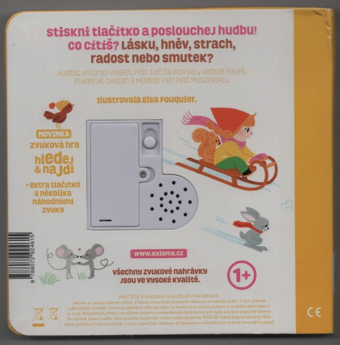 Stiskni tlačítko a poslouchej hudbu. Co cítíš? Lásku, hněv, strach, radost nebo smutek? Emoce v hudbě i životě s melodiemi A. Vivaldiho, P. I. Čajkovského, G. Fauré, F. Chopina a M. P. Musorgského. NOVINKA: Na poslední dvoustraně je zvuková hra Hledej & najdi. Zvukové tlačítko přehrává náhodně pět zvuků nebo melodií, které patří k pěti obrázkům. Děti mají za úkol přiřadit zvuk nebo melodii ke správnému obrázku. Toto zvukové leporelo ve zvětšeném formátu s reliéfní ražbou obrázků na obálce má nově zaoblené rohy a funguje se dvěma vyměnitelnými tužkovými bateriemi. Všechny zvukové nahrávky jsou ve vysoké kvalitě a samozřejmě nechybí ani tlačítko ON/OFF, které umožňuje leporelo kdykoliv vypnout.