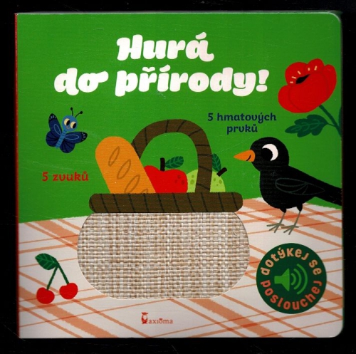 Dotykové a zvukové leporelo. Jaké zvuky zaslechnete, když se vydáte do přírody na piknik? Třeba zvonění zvonku, když vás bude někdo předjíždět na kole, bučení kraviček, labuť na rybníce, malého srnečka, který volá svou maminku, zpěv kosa nebo kačenu, která vede mláďata přes pole. Na každé stránce jsou zakomponovány až dva různé, většinou textilní materiály, které jsou příjemné na dotek a na každé stránce je také nezbytné zvukové dotykové tlačítko, k jehož spuštění není zapotřebí síly. Reálné zvuky zvířat jsou ve vysoké kvalitě. Součástí knihy je tužková baterie UM-4 nebo LR-03.