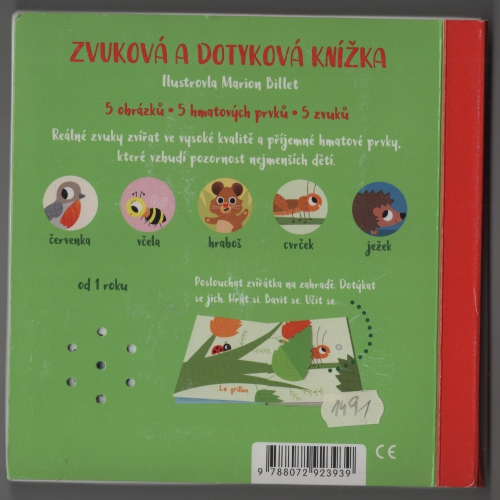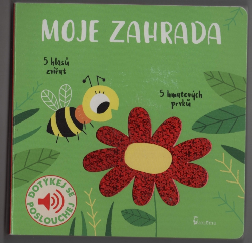 Dotykové a zvukové leporelo. Jaké zvuky mohou děti zaslechnout na zahradě a nebo na louce? Červenku, včelku, hraboše, cvrčka i ježka. Na každé stránce jsou zakomponovány až dva různé, většinou textilní materiály, které jsou příjemné na dotek a na každé stránce je také nezbytné zvukové dotykové tlačítko, k jehož spuštění není zapotřebí síly. Reálné zvuky zvířat jsou ve vysoké kvalitě. Pro děti od 1 roku.