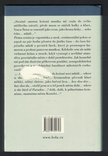 Prima sezóna je vzpomínka a stesk, sentimentální pokus se aspoň na pár hodin přenést do jiného času – do času báječného mládí a prvních lásek, který je prostoupen humorem a prolnut jazzovou muzikou. Kdykoliv sem ale může vtrhnout hrůza a strach, když vystoupí z nevlídné atmosféry provinčního města v době protektorátu. Jak kouzelně zní pod tím dusivým příkrovem geniální, nenapodobitelná povrchnost a neodolatelná banálnost milostných rozhovorů!