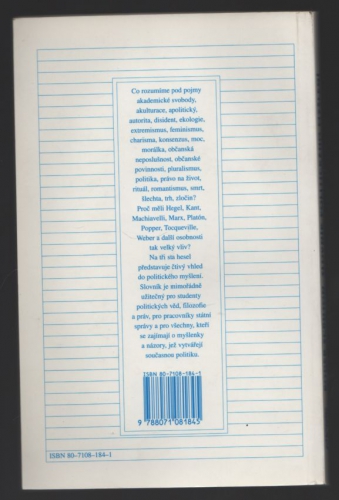 Slovník, obsahující přes 300 hesel, představuje čtivý vhled do politického myšlení. Je mimořádně užitečný pro studenty politických věd, filozofie a práv a pro všechny, kteří se zajímají o myšlenky a názory, jež vytvářejí současnou politiku.
