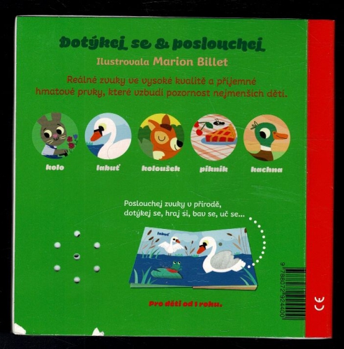 Dotykové a zvukové leporelo. Jaké zvuky zaslechnete, když se vydáte do přírody na piknik? Třeba zvonění zvonku, když vás bude někdo předjíždět na kole, bučení kraviček, labuť na rybníce, malého srnečka, který volá svou maminku, zpěv kosa nebo kačenu, která vede mláďata přes pole. Na každé stránce jsou zakomponovány až dva různé, většinou textilní materiály, které jsou příjemné na dotek a na každé stránce je také nezbytné zvukové dotykové tlačítko, k jehož spuštění není zapotřebí síly. Reálné zvuky zvířat jsou ve vysoké kvalitě. Součástí knihy je tužková baterie UM-4 nebo LR-03.