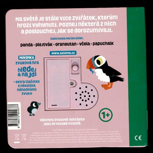 Stiskni tlačítko a poslouchej, jak se dorozumívají zvířátka, kterých na světě ubývá a musíme je chránit: panda, plejtvák, orangutan, včela a papuchalk. NOVINKA: Na poslední dvoustraně je zvuková hra Hledej & najdi. Zvukové tlačítko přehrává náhodně pět zvuků nebo melodií, které patří k pěti obrázkům. Děti mají za úkol přiřadit zvuk nebo melodii ke správnému obrázku. Toto zvukové leporelo má nově reliéfní ražbu obrázků na obálce, zaoblené rohy a funguje se dvěma vyměnitelnými tužkovými bateriemi namísto původních knoflíkových. Všechny zvukové nahrávky jsou ve vysoké kvalitě a samozřejmě nechybí ani tlačítko ON/OFF, která umožňuje leporelo kdykoliv vypnout. Vyměnitelné tužkové baterie.
