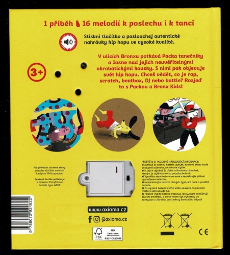Pejsek Packa má rád hudbu a hodně o ní ví. V této knížce se s ním vydáte do newyorské čtvrti Bronx, v jejíchž ulicích potkává Packa tanečníky a žasne nad jejich neuvěřitelnými akrobatickými kousky. S nimi pak objevuje svět hip ropu. Chceš vědět, co je rap, scratch, beatbox, DJ nebo battle? Rozjeď to s Packou a Bronx Kids! 1 příběh a 16 melodií k poslechu i tanci. Možnost výměny baterie zvukového strojku.